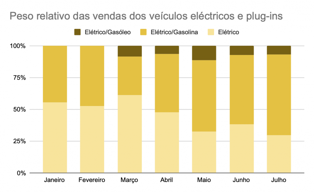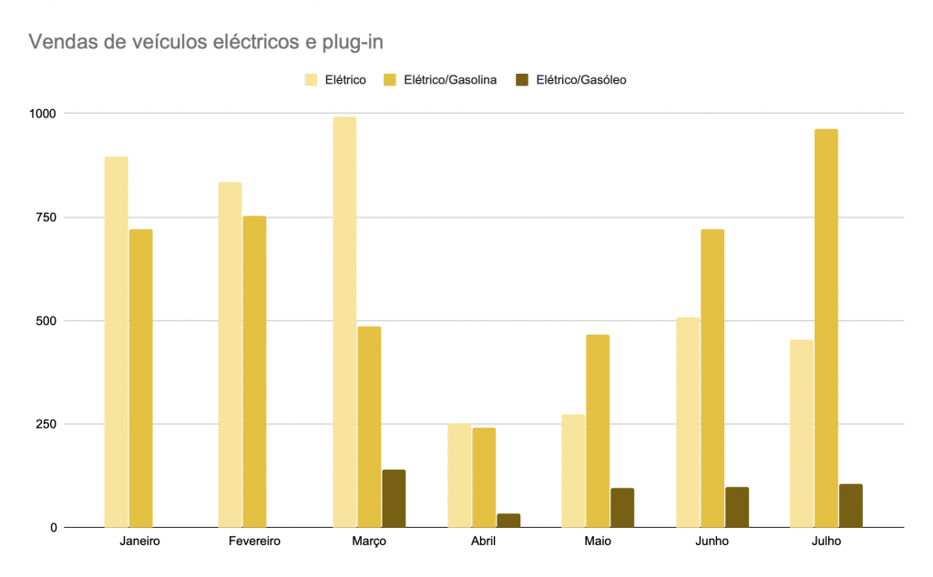 Em primeiro lugar, os veículos a combustíveis fósseis continuam a lutar pelo primeiro lugar, tendo o de Julho sido liderado pelos veículos movidos a gasóleo, mas não por grande vantagem.